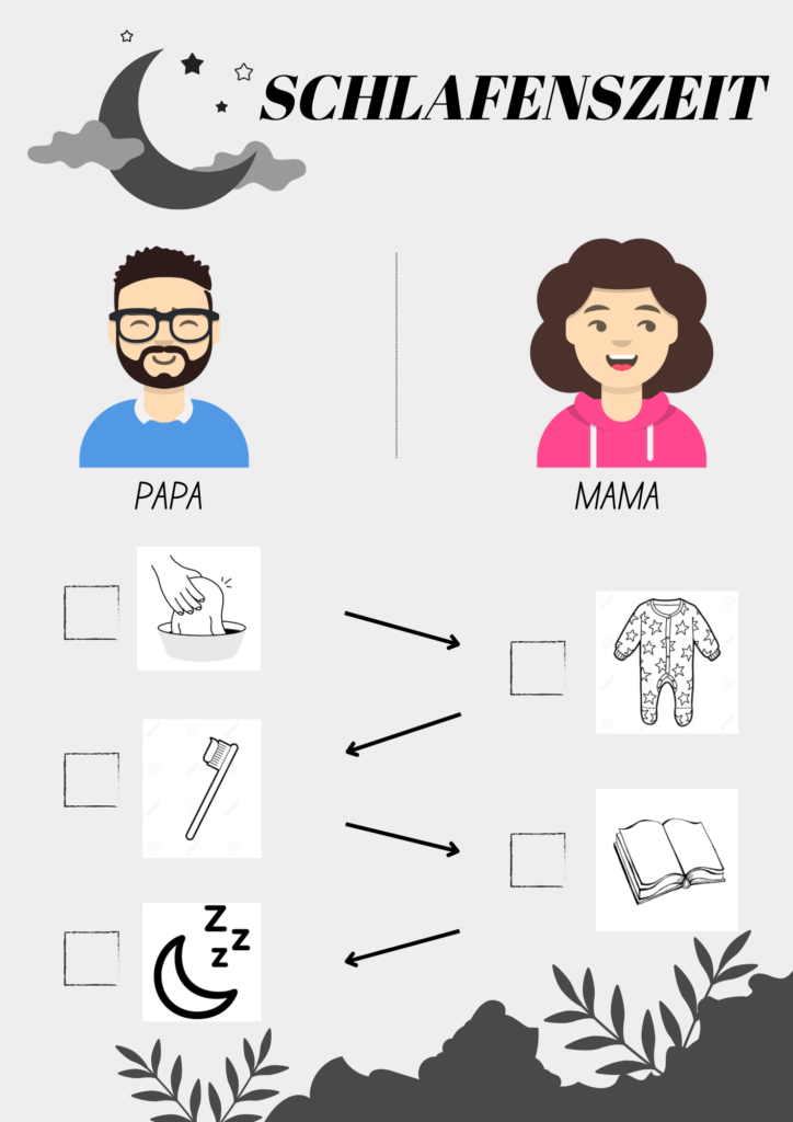 Schon morgens haben wir gemeinsam eingekreist: Heute ist Papa- oder Mamatag. Abends haben wir dann gemeinsam abgehakt: Erst waschen, dann den Schlafanzug anziehen, dann Zähne putzen, dann Lesen und dann ins Bett.
